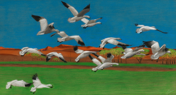 Images: “Falling Leaf” by Pattie Young, “Snow Geese in Adrian” by Llona Jensen and Catfish D’Grey (Mike Dixon and Chad Lord)