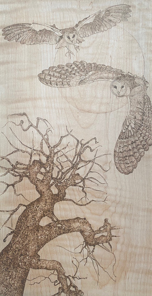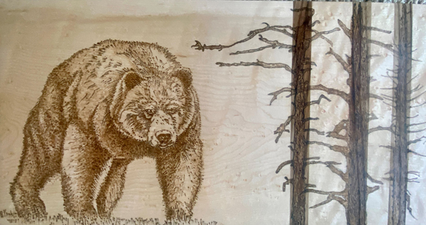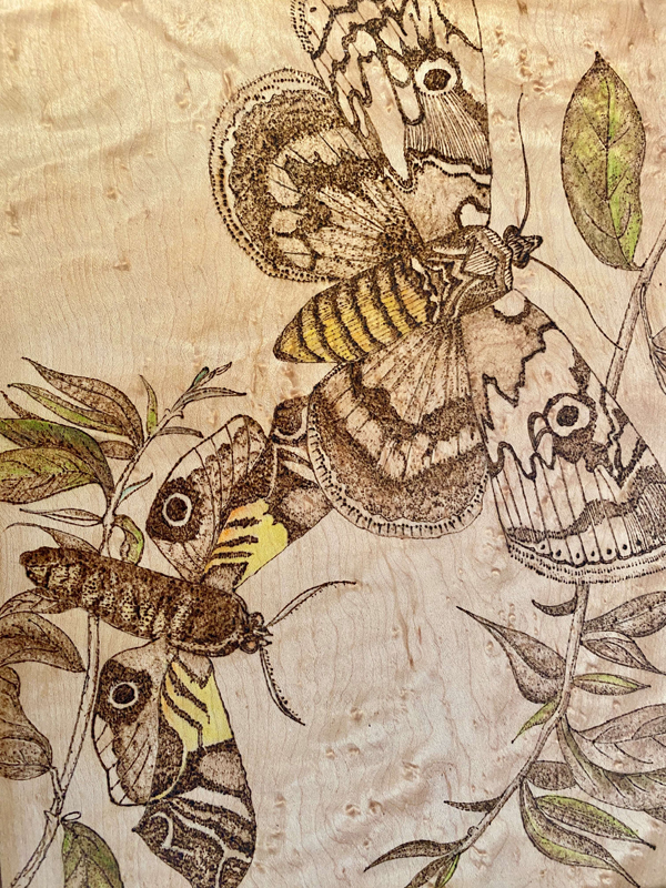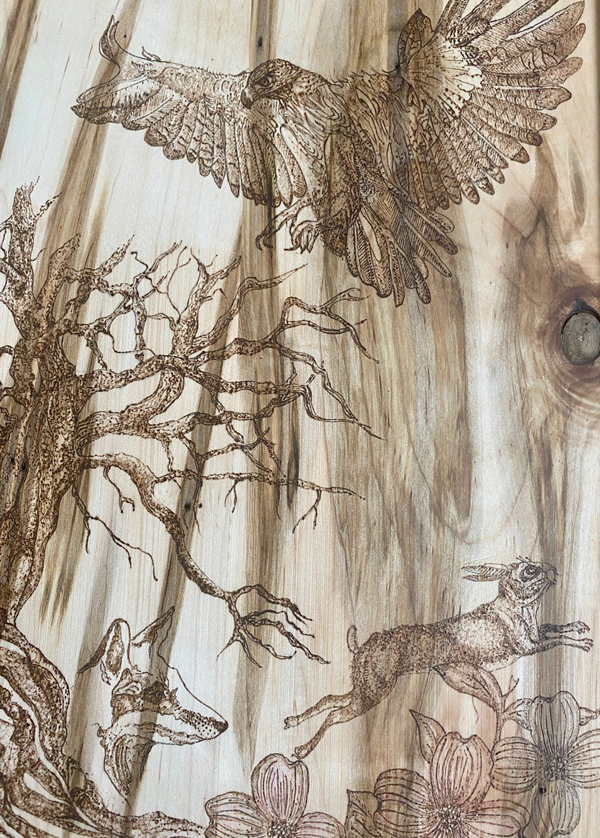 Mediums of expression are vast for this couple. We love wood, its colors, textures, and the meanders within its grain. It is visceral. With wood, we design abstract sculptures, functional pieces that highlight the complexity of wood, and realistic pyrographic depictions of our natural world. Wood is a medium of the earth… it has tales to tell of danger and regeneration, death, life and time, and beautiful things that need no words. – Nellie and Clair Bowman