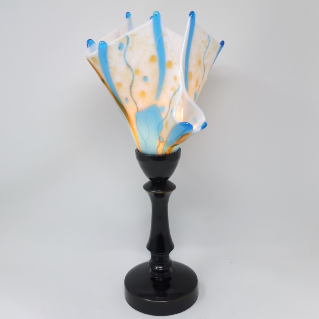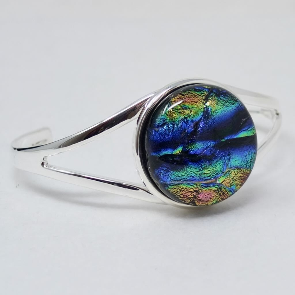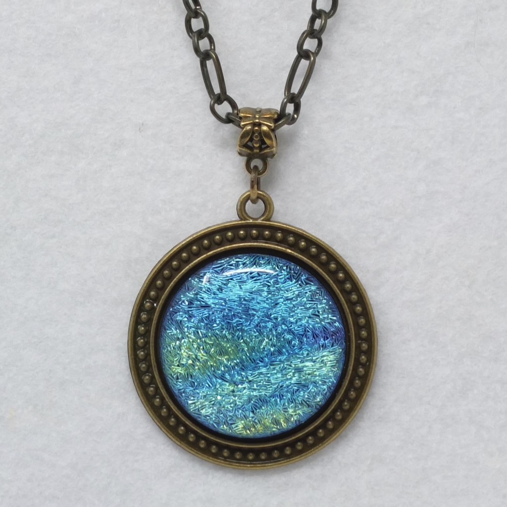 In early adulthood I decided to experiment with a stained glass class at a community college, and after a short acquaintanceship, I knew I was in love with the medium of glass. My stained glass obsession continued, expanded, and has shifted focus toward creating fused glass pieces. These are vessel types: bowls, plates, vases, and lampshades. Most recently my work has shifted to include creating jewelry, mostly using beautiful dichroic glass which, because of its texture, shine, and unique changing colors, makes amazing cabochons for jewelry.