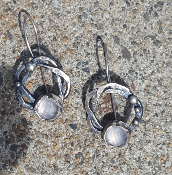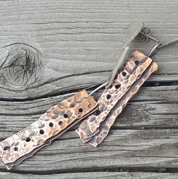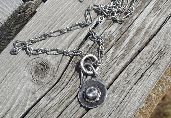 So, I design little pieces of metal jewelry. I choose the metal, either copper bronze or sterling silver. I cut metal, I pierce metal, then jewelry-saw the metal. I hammer the metal to different shapes and also texture the metal in many different ways. I bend, I reticulate and use many other ways to create an interesting surface. Then I solder the pieces of metal together. The solder acts like glue. I give the jewelry different styles of patina. I very often look for a suitable gemstone that I create a bezel around, so to set it on a chosen place on the object. It could be on a ring, on a pendant or a pair of earrings. This will usually enhance the jewelry immensely. I create designs and hand-fabricate jewelry in sterling silver, bronze, copper, gold-filled, also 18 and 14 carat gold.