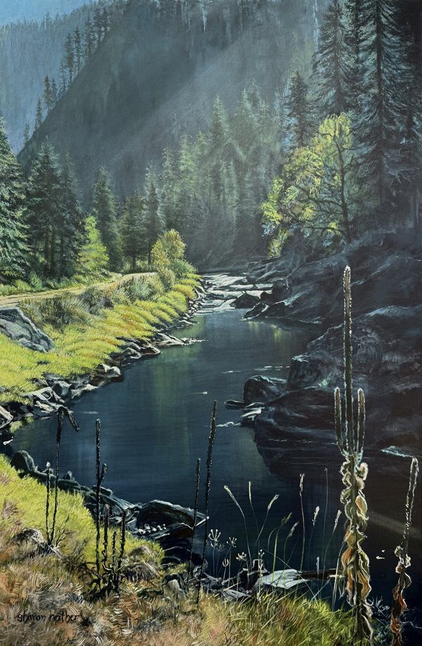 Featured for the month of March are the Idaho-inspired landscape paintings by gallery member and local artist Sharon Herther. Raised on a dairy farm in Meridian, Idaho, Sharon worked outdoors and developed a deep love of the Idaho outdoors. Her past experience includes creating interpretive signs for the State of Idaho, illustrated Discovery Maps for McCall and Twin Falls and landscapes painted on heart sculptures for the Payette Land Trust. Her paintings are known for their exquisite beauty and detail.