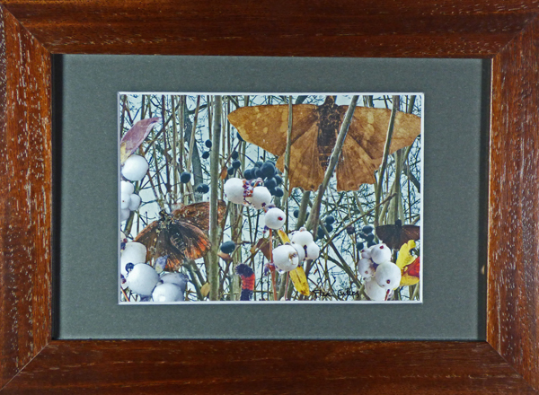 Description: 12″x9″ paper collage constructed from fall berry, foliage and plant photographs. Insect images are sourced from old photography and text books. Piece is coated with a UV protection matte finish, matted, and framed with wood (walnut) frame.