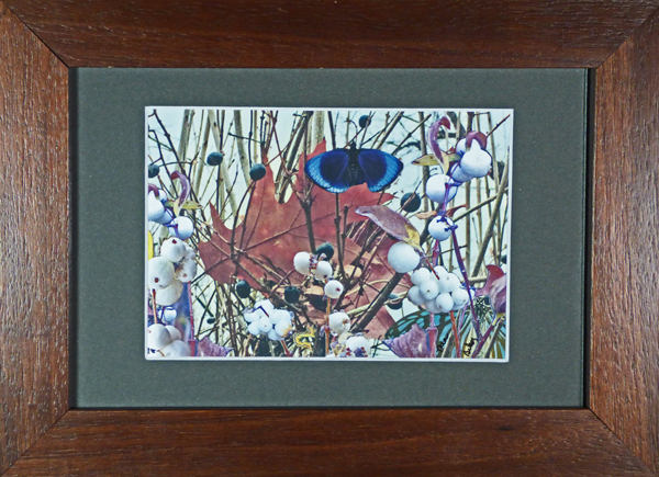 Description: 12″x9″ paper collage constructed from fall berry, foliage and plant photographs. Insect images are sourced from old photography and text books. Piece is coated with a UV protection matte finish, matted, and framed with wood (walnut) frame.